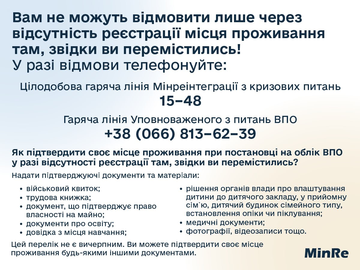 ☝️Наголошуємо: чинним законодавством передбачено, що відсутність такої реєстрації не може бути підставою для відмови у видачі довідки ВПО.