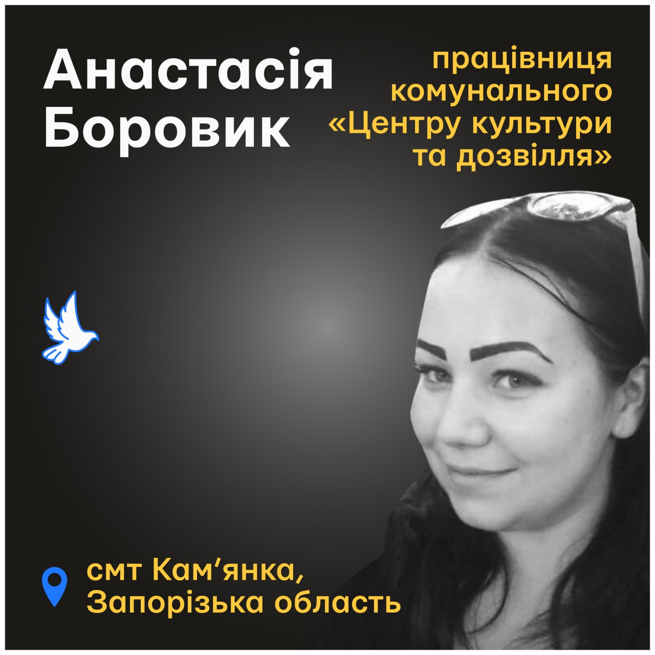 Анастасія Боровик завідувала культурно-масовим сектором комунального закладу «Центр культури та дозвілля» Кам'янської селищної ради. Голова Запорізької ОВА Олександр Старух зазначив, що ні вона, ні її колеги не пішли на співпрацю з росіянами, коли ті окупували Кам’янку.