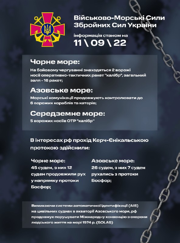 Станом на 11.09.2022:   в Чорному морі на бойовому чергуванні знаходяться 2 ворожі носії крилатих ракет «калібр», загальний залп