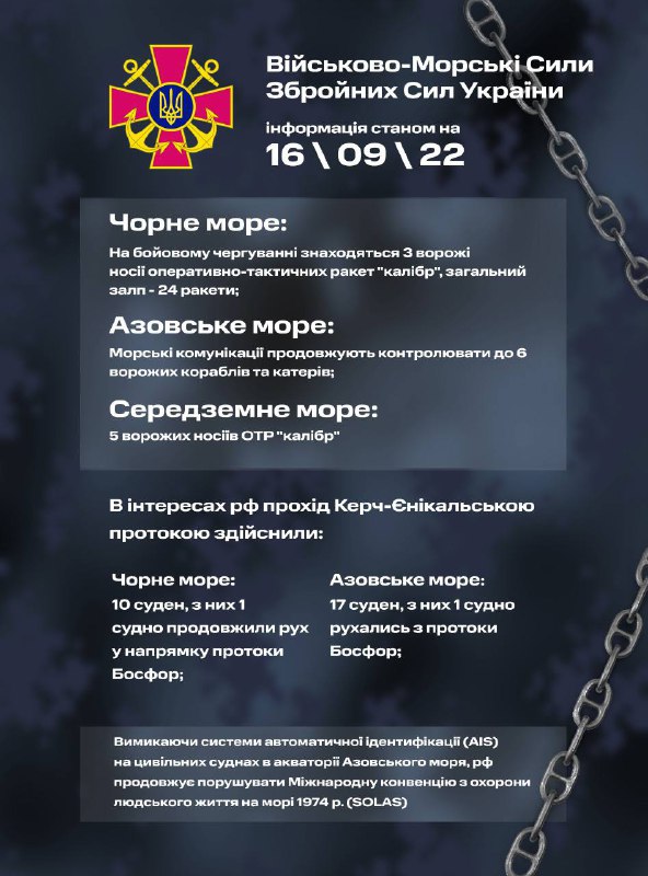 в Азовському морі ворог продовжує контролювати морські комунікації утримуючи на бойовому чергуванні до 6 ворожих кораблів та катерів;