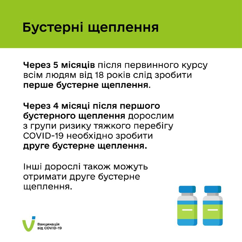 Друга бустерна доза дозволяється всім повнолітнім з інтервалом щонайменше 4 місяці після першої бустерної дози.