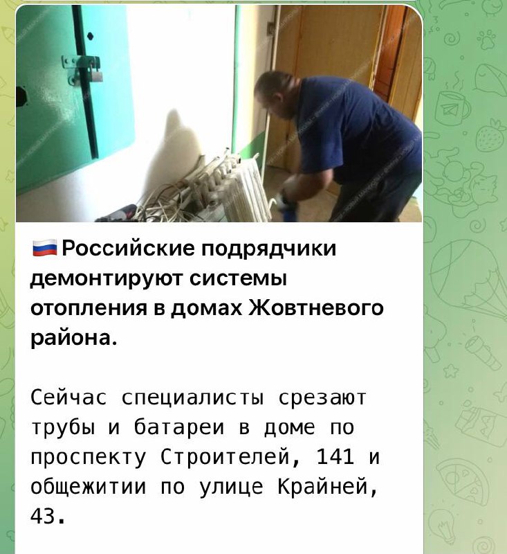 Окупанти протягом серпня та початку вересня писали про те, як вони ріжуть батареї та демонтують системи опалення у будинках. Взамін обіцяли встановити нові пластикові труби та алюмінієві радіатори.