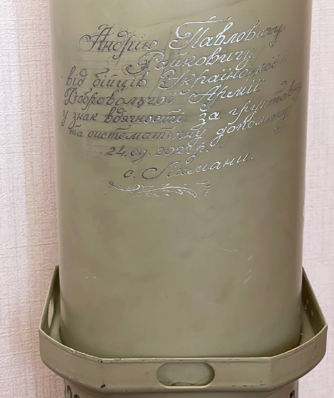 Отримав вісточку з фронту від наших хлопців. Бійці Української Добровольчої армії передали тубус від снаряду. 29.09.2022, Четвер | 15:57 Автор допису: Голова Кіровоградської обласної військової адміністрації Отримав вісточку з фронту від наших хлопців. Бійці Української Добровольчої армії передали тубус від снаряду. В тому числі і такою зброєю наші вибивають ворога з української землі. Джерело Друк / PDF