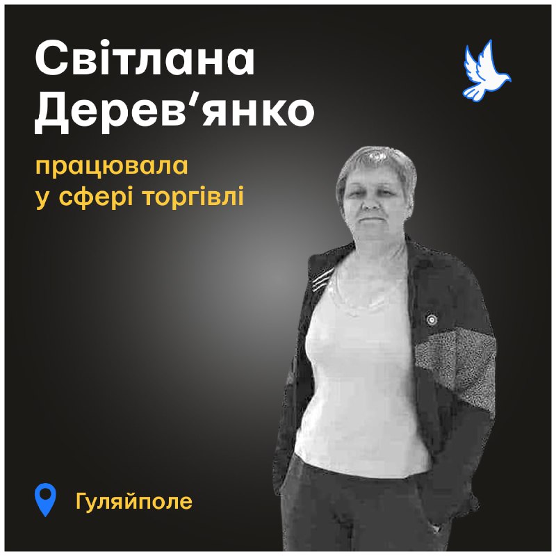 52-річна Світлана Дерев'янко загинула 19 липня під час ворожого обстрілу її рідного міста Гуляйполе, що на Запоріжжі. Тоді ввечері російські війська атакували центр Гуляйполя з «Градів» та артилерії.