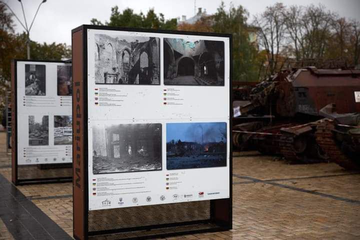Виставка «Варшава – Маріуполь» складається із 16 пар фото, на яких порівнюється Варшава 1944 року і сучасний Маріуполь, який знищений російськими окупантами.