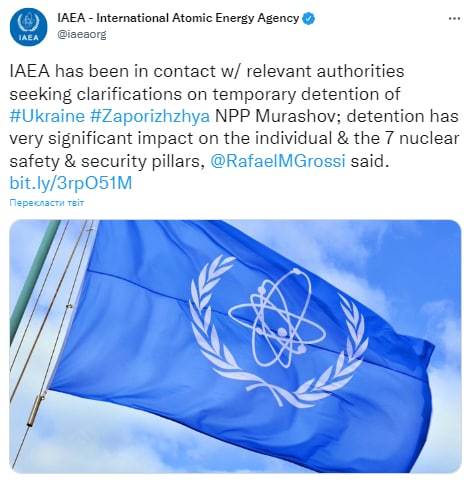 МАГАТЕ звернулося «до відповідних органів», щоб отримати роз’яснення щодо затримання директора Запорізької АЕС Ігора Мурашова, йдеться у Twitter Агентства.