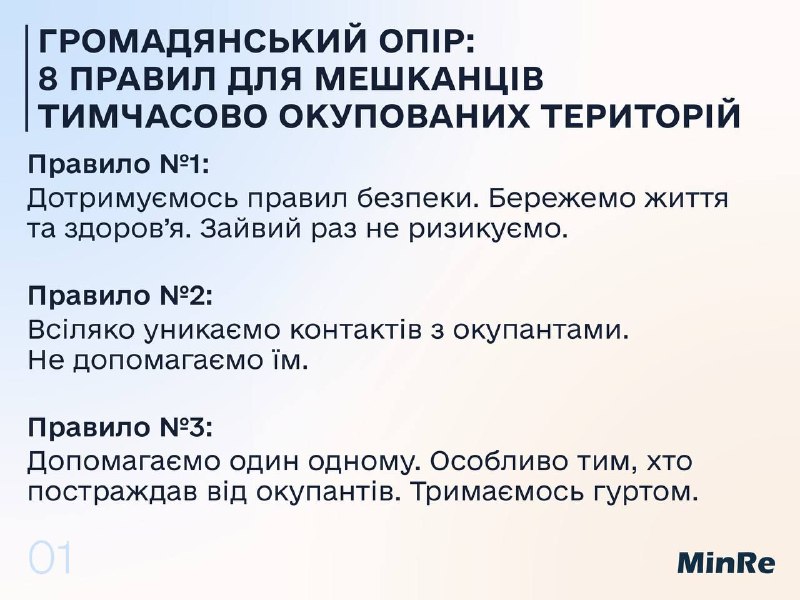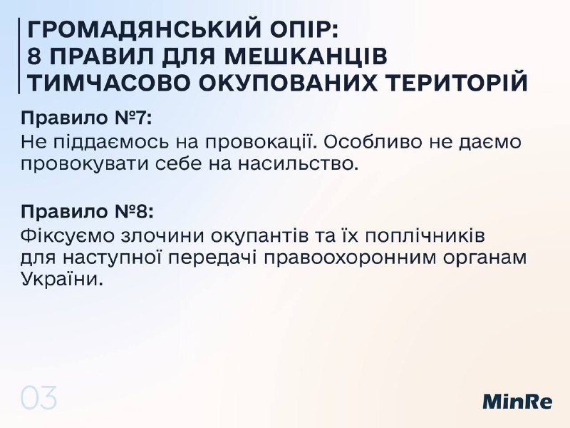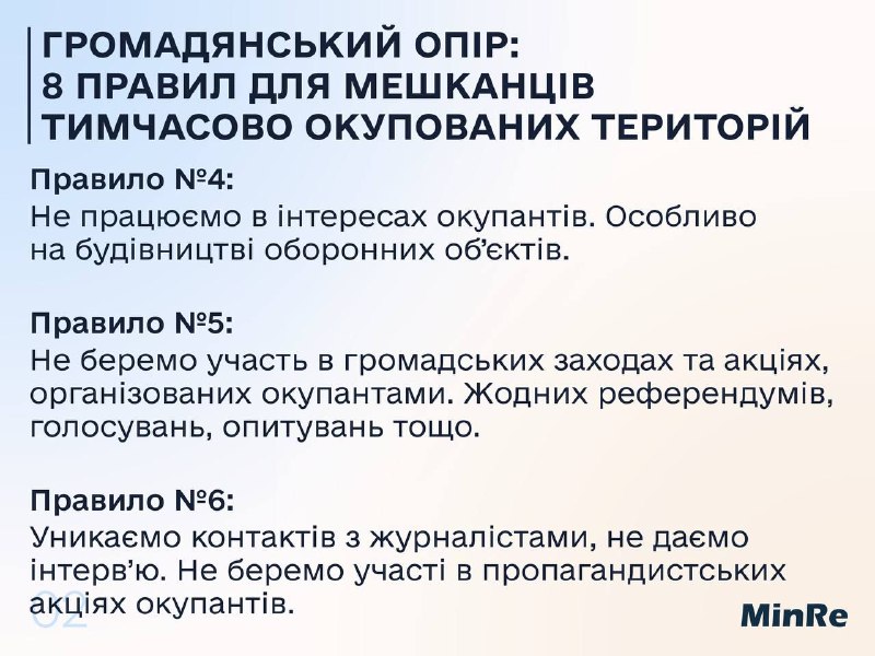 ❗️Громадянський опір: 8 правил для мешканців тимчасово окупованих територій Щодня ЗСУ звільняють все більше й більше українських територій 5.10.2022, Середа | 10:44 Автор допису: Запорізька обласна військова адміністрація ❗️Громадянський опір: 8 правил для мешканців тимчасово окупованих територій Щодня ЗСУ звільняють все більше й більше українських територій. Кожен українець має робити свій внесок в перемогу над агресором. Це стосується і наших громадян, які потрапили в тимчасову окупацію. 📋 Команда Мінреінтеграції підготувала 8 правил для мешканців тимчасово окупованих територій. За матеріалами Мінреінтеграції Джерело Друк / PDF