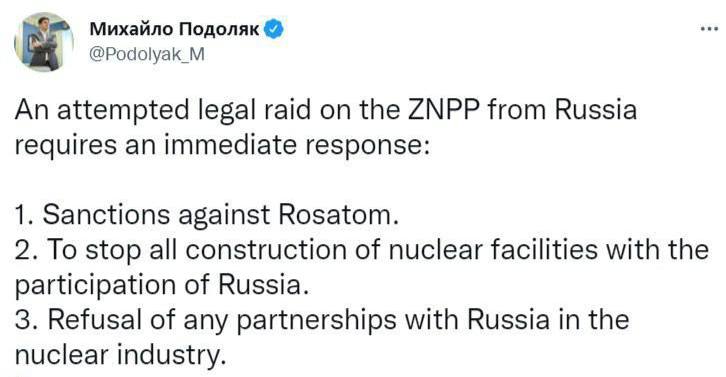 📢 Радник глави Офісу Президента Михайло Подоляк переконаний, що необхідно негайно накласти санкції на Росатом та атомну промисловість країни-агресорки
