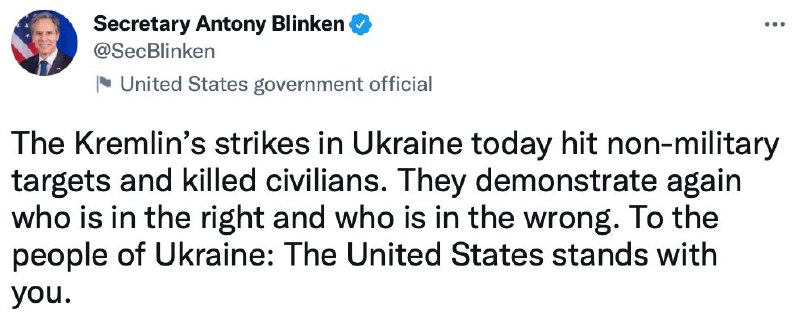 Держсекретар США Ентоні Блінкен заявив, що ракетні удари не можуть зламати ні духу України, ні «нашої рішучості підтримувати Україну».