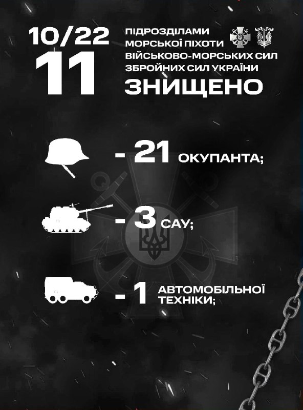 11 жовтня, військовослужбовці військових частин та підрозділів Командування морської піхоти ВМС ЗС України у складі угруповань стійко та мужньо протистояли російським окупантам на закріплених ділянках фронту. Протягом минулої доби морські піхотинці знищили 9 загарбників.