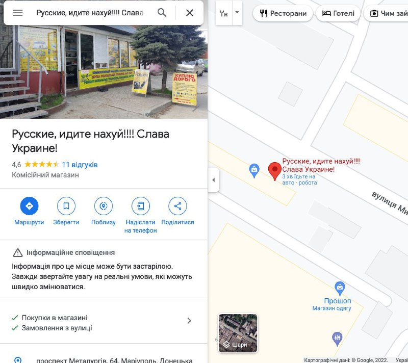 Маріупольський спротив у Google-Maps. Це справжнє відношення маріупольців до російських окупантів 12.10.2022, Середа | 12:33 Автор допису: Маріупільська міська рада Маріупольський спротив у Google-Maps. Це справжнє відношення маріупольців до російських окупантів. Таке не покажуть пропагандисти – https://g.page/Skupkaradiodetaley?share 🇺🇦Маріуполь – це Україна! Жодні фейкові "референдуми" цього не змінять. Джерело Друк / PDF