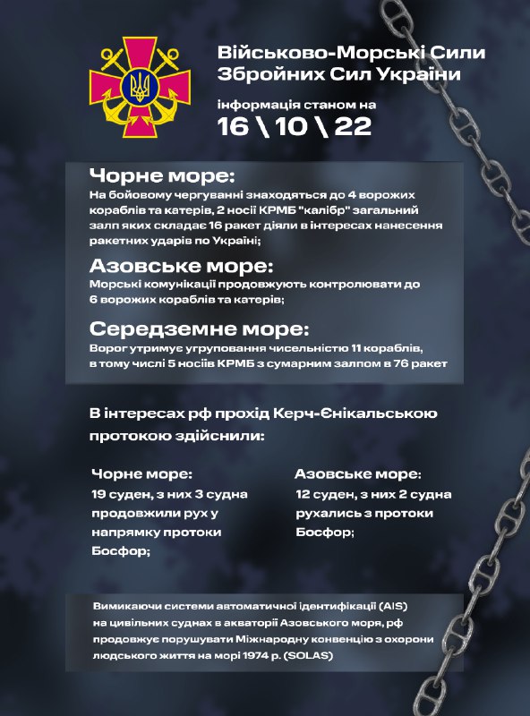 ​​Станом на 16.10.2022: в Чорному морі на бойовому чергуванні знаходяться до 4 ворожих кораблів та катерів, 2 носії КРМБ “калібр&quot