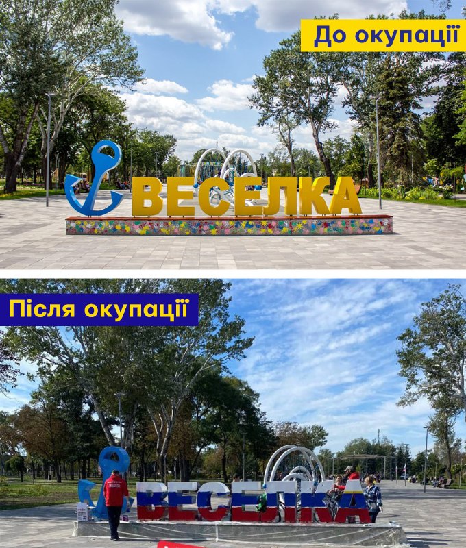 😡Парк «Веселка», який ми реконструювали в українському Маріуполі – перефарбували у кольори окупації. росія намагається символічно присвоїти собі минулі заслуги. То видаючи наші автобуси за «подарунки» від петербургу, то зробивши напис у парку кольору рабства. Але місцеві все знають.