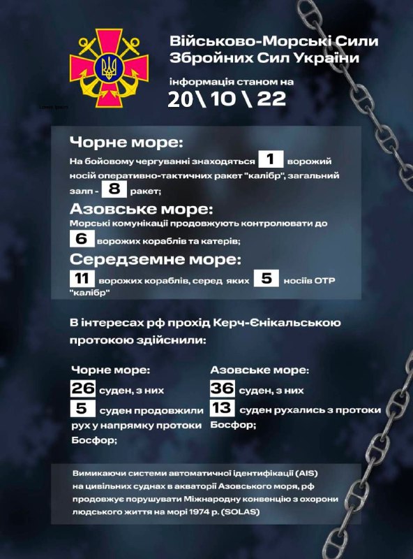 Станом на 20.10.2022: в Чорному морі на бойовому чергуванні знаходяться 1 ворожий носій крилатих ракет «калібр», загальний залп