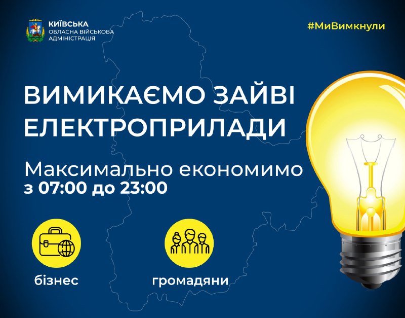 Окупанти продовжують атакувати енергетичну інфраструктуру нашої країни. Для стабілізації системи маємо економити 22.10.2022, Субота | 14:22 Автор допису: Голова Київської обласної військової адміністрації Окупанти продовжують атакувати енергетичну інфраструктуру нашої країни. Для стабілізації системи маємо економити. Відключаємо зайве. Не користуємося енергоємними приладами. Ставимось до цього відповідально. Заощаджуємо. 🇺🇦 Джерело Друк / PDF