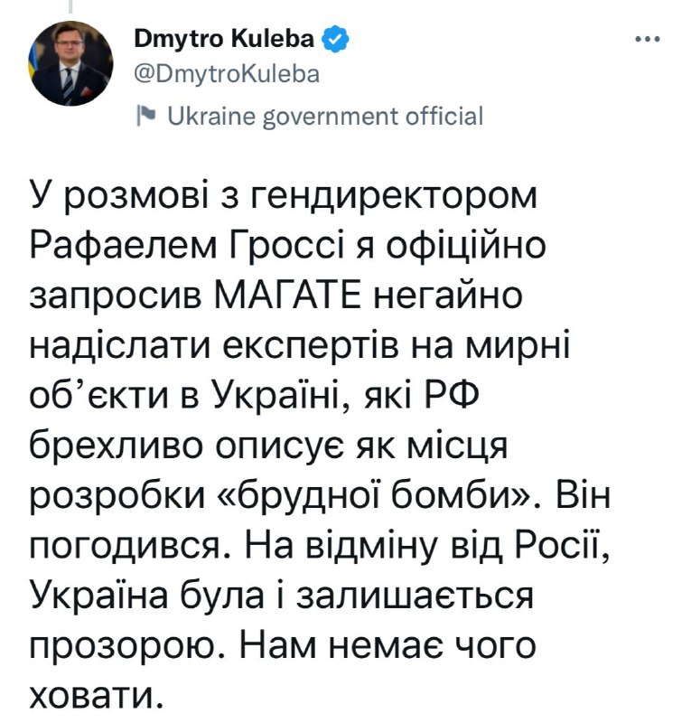 «В розмові з гендиректором Рафаелем Гроссі я офіційно запросив МАГАТЕ негайно надіслати експертів на мирні об’єкти в Україні, які РФ брехливо описує як місця розробки «брудної бомби». Він погодився. На відміну від росії, Україна була і залишається прозорою. Нам немає чого ховати», – заявив Дмитро Кулеба.