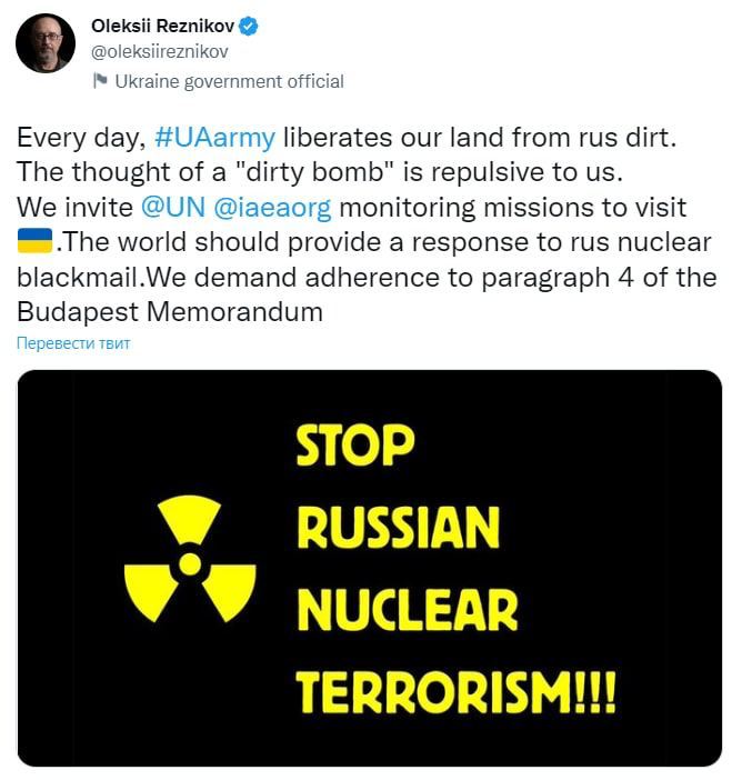 «Кожен день українська армія звільняє нашу землю від російського бруду. Думка про «брудну бомбу» – огидна ля нас», – написав у TwitterМіністр оборони України Олексій Резніков.
