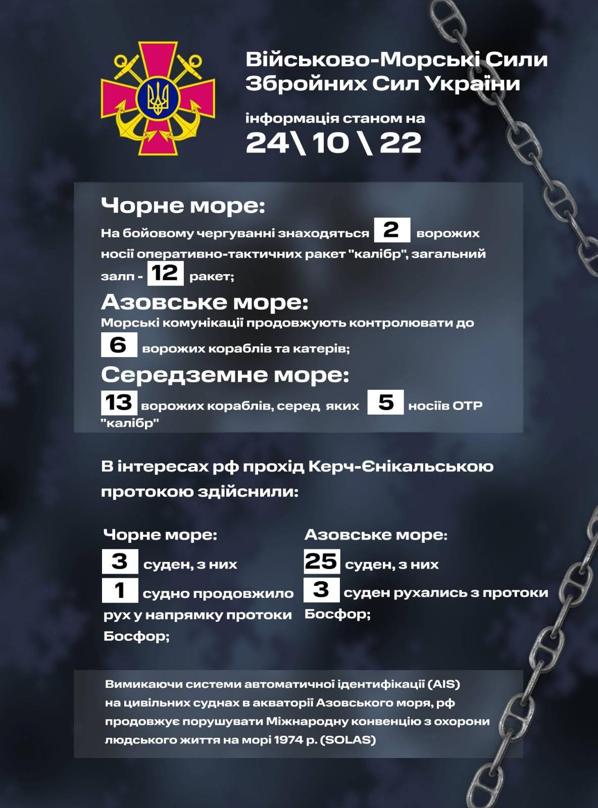 рф продовжує порушувати Міжнародну конвенцію з охорони людського життя на морі 1974 р. (SOLAS), вимикаючи системи автоматичної ідентифікації (AIS), на цивільних суднах в акваторії Азовського моря.