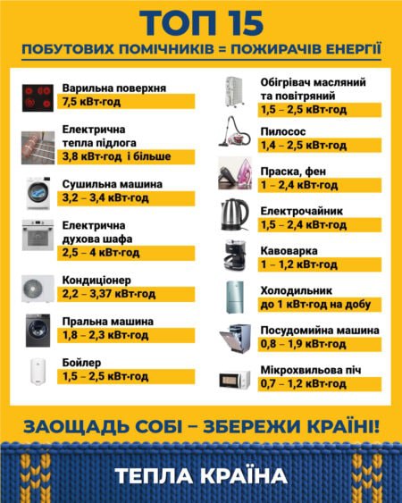 З 07:00 до 22:00 не користуйтеся, будь ласка, енергоємними електроприладами, без яких можна обійтися протягом дня, та максимально обмежте користування тими електроприладами, які вам конче необхідні.