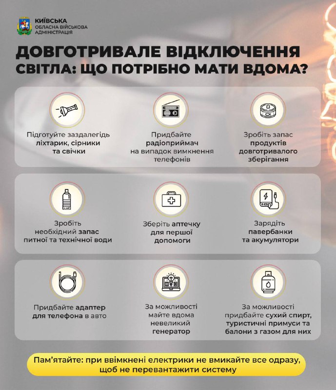 У Київській області застосовуються обмеження постачання електроенергії. Вимкнення можуть тривати довше, ніж 4 години 27.10.2022, Четвер | 20:20 Автор допису: Голова Київської обласної військової адміністрації У Київській області застосовуються обмеження постачання електроенергії. Вимкнення можуть тривати довше, ніж 4 години. Це необхідно, щоб подолати наслідки нічної атаки країни-терориста. Усі служби працюють над відновленням та стабілізацією ситуації. 🇺🇦 Олексій Кулеба | Джерело Друк / PDF
