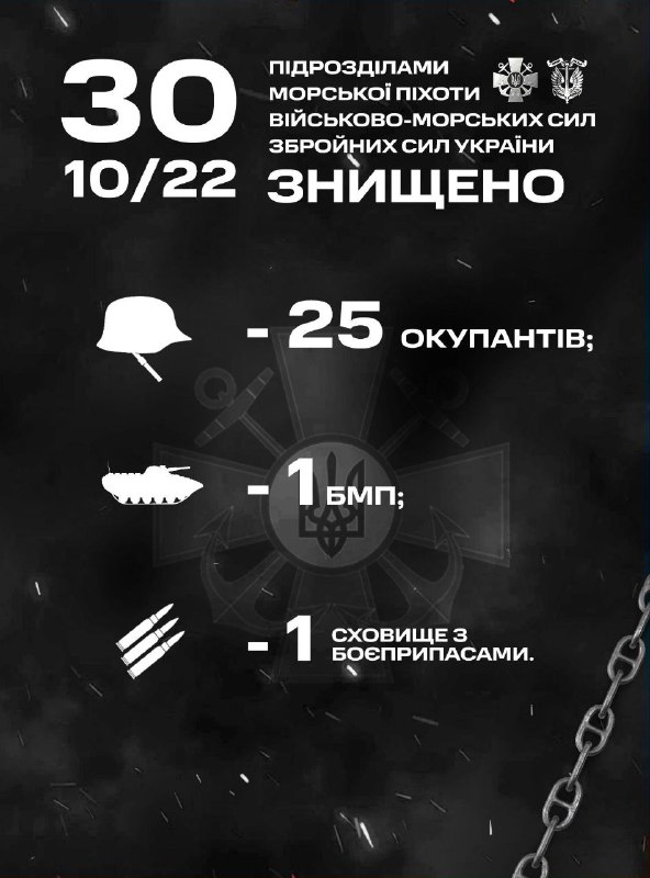 🇺🇦⚓ 30 жовтня, військові частини та підрозділи Командування морської піхоти Військово-Морських Сил Збройних Сил України, які входять до складу угруповань продовжували виконувати завдання щодо відсічі повномасштабної збройної агресії російської федерації. Минулої доби морські піхотинці знищили 25 осіб живої сили. Артилерійські військові частини та підрозділи Командування морської піхоти ВМС ЗС України наносили вогневе ураження по загарбниках, в результаті чого наші воїни знищили бойову машину піхоти та сховище з боєприпасами. Остаточні втрати ворога уточнюються. Слава Україні! #stoprussia#ВІРЮвЗСУ