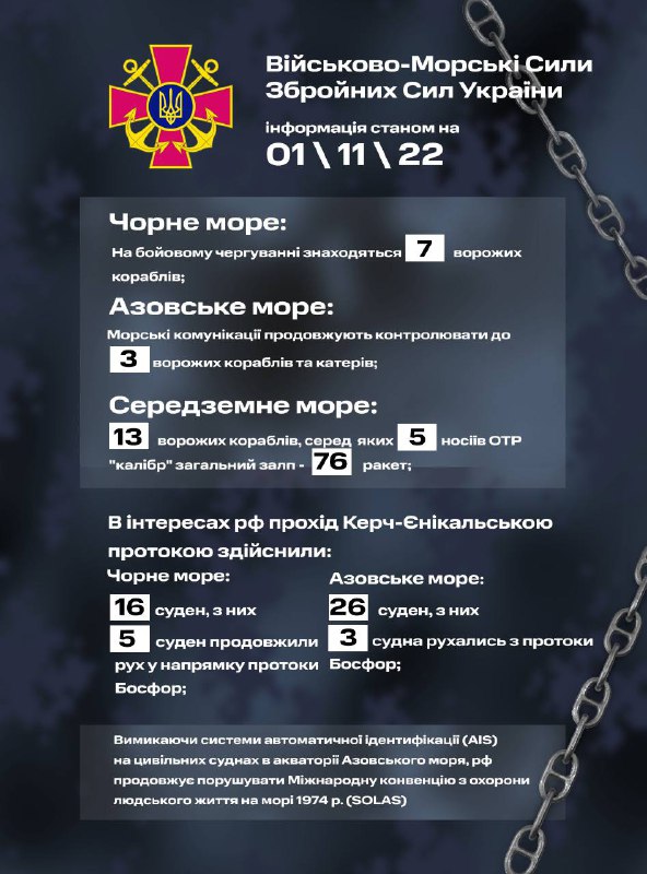 Станом на 01.11.2022: в Чорному морі на бойовому чергуванні знаходяться 7 ворожих кораблів