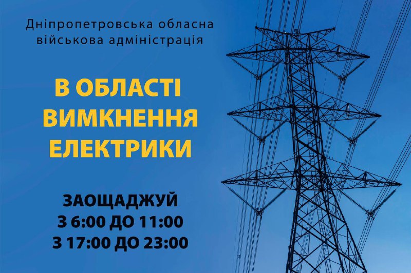 Енергетики знову впровадили на Дніпропетровщині відключення електрики. 3.11.2022, Четвер | 10:07 Автор допису: Голова Дніпропетровської обласної військової адміністрації Енергетики знову впровадили на Дніпропетровщині відключення електрики. Зранена ворожими атаками система не справляється з навантаженням. Заощаджуємо усюди! Заощаджуємо усі! Джерело Друк / PDF