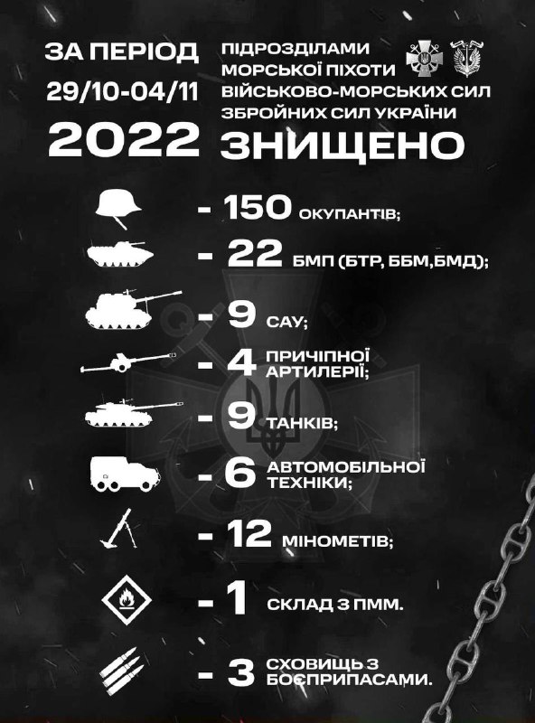 За уточненими даними в період з 29.10.2022 по 04.11.2022 наші воїни знищили: особового складу – понад 150 окупантів, танків –9, БТР (БМД, БМП, ББМ) – 22, САУ – 9, причепної артилерії – 4, мінометів – 12, АТТ – 6, а також 3 сховища з боєприпасами та склад з пально-мастильними матеріалами.