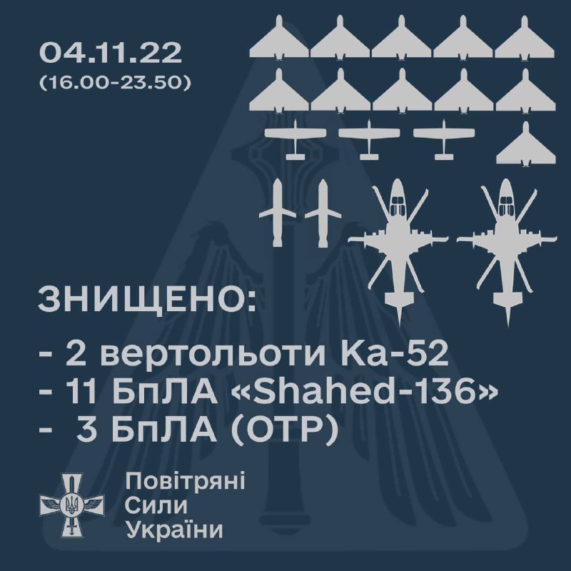 ⚡️ЗБИТО ДВА ВЕРТОЛЬОТИ КА-52, ДВІ КРИЛАТІ РАКЕТИ «КАЛІБР», 11 БПЛА «SHAHED-136» ТА ТРИ БПЛА ОПЕРАТИВНО-ТАКТИЧНОГО РІВНЯ