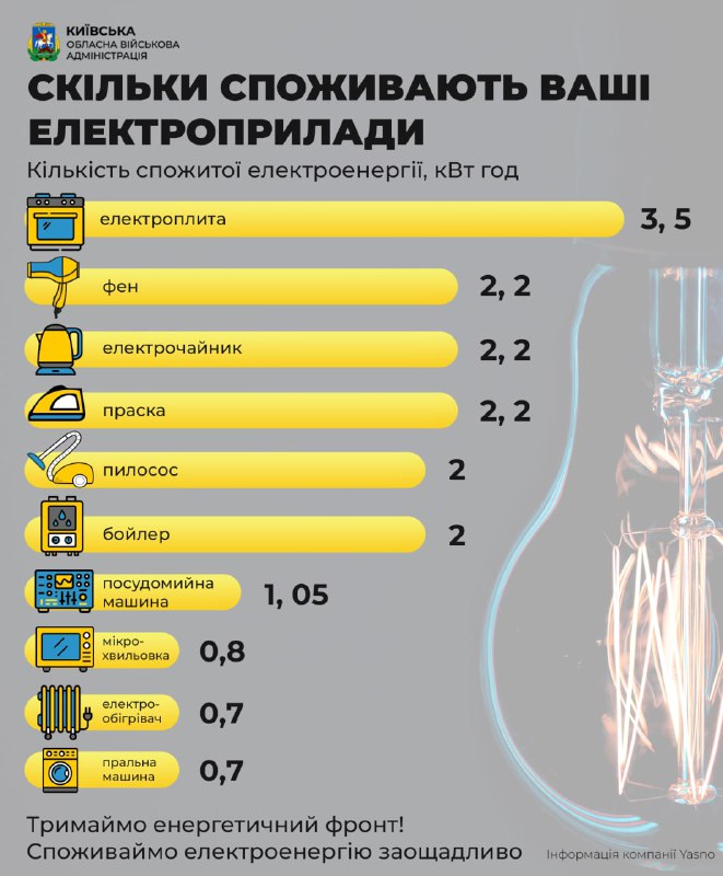 На інфографіці — найбільш енергоємні прилади та їхня приблизна кількість споживання електроенергії за годину. Мінімізуйте використання та не вмикайте одночасно. Також радимо вимикати ці електроприлади в піковий час навантаження на мережу: із 6:00 до 9:00 та із 17:00 до 23:00.