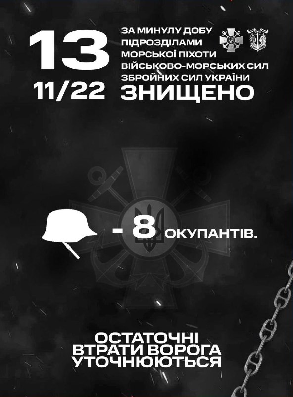 🇺🇦⚓ 12 листопада, військові частини та підрозділи Командування морської піхоти Військово-Морських Сил Збройних Сил України, які входять до складу угруповань продовжували виконувати завдання щодо відсічі повномасштабної збройної агресії російської федерації. Артилерійські військові частини та підрозділи Командування морської піхоти ВМС ЗС України наносили вогневе ураження по загарбниках, в результаті чого наші воїни знищили 8 окупантів. Остаточні втрати ворога уточнюються. Слава Україні! #stoprussia#ВІРЮвЗСУ