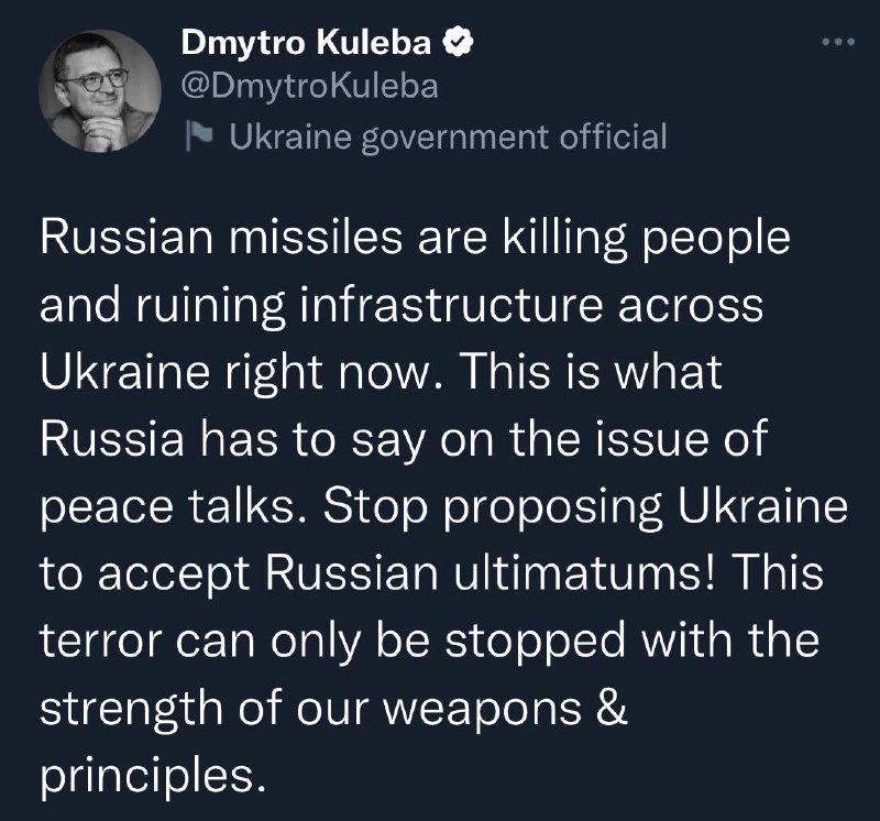 «російські ракети зараз вбивають людей і руйнують інфраструктуру по всій Україні. Ось що говорить росія щодо мирних переговорів. Припиніть пропонувати Україні прийняти російські ультиматуми! Цей терор можна зупинити лише силою нашої зброї та принципів», – написав Кулеба.