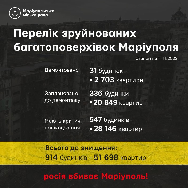 ☝️Ця статистика стосується багатоповерхівок, які самі окупанти визнали зруйнованими, але реальна картина в місті страшніше. Лише у приватному секторі за нашими підрахунками 11384 будинків серьйозно пошкоджено/взагалі знищено.