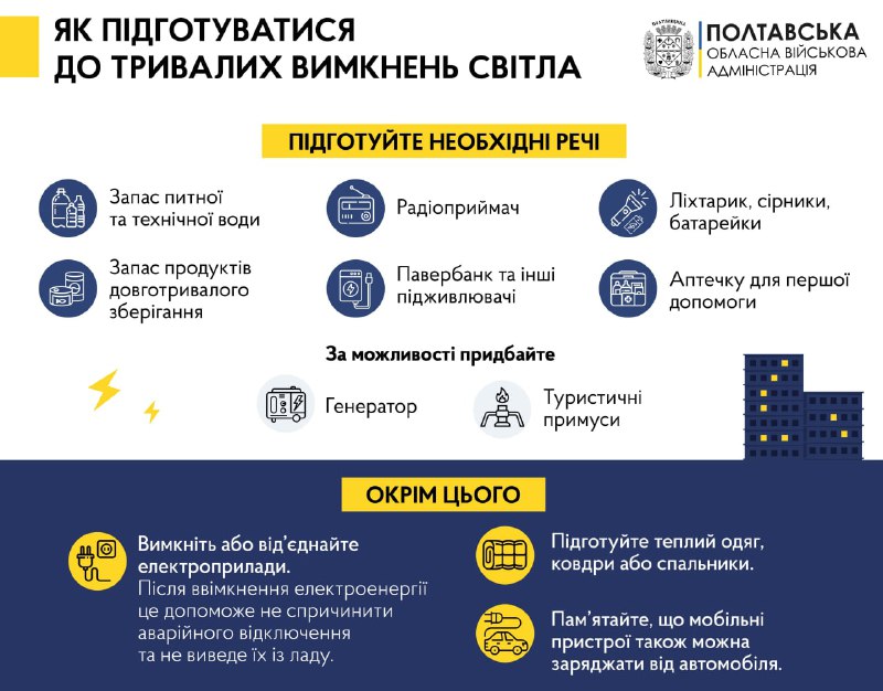 Окупанти вчора цинічно вдарили по енергоінфраструктурі, щоб залишити людей без світла й тепла. Але їм нас не залякати. Потрібно бути готовими до довших відключень: зробити запас води, теплих речей, завчасно зарядити пристрої та павербанки.