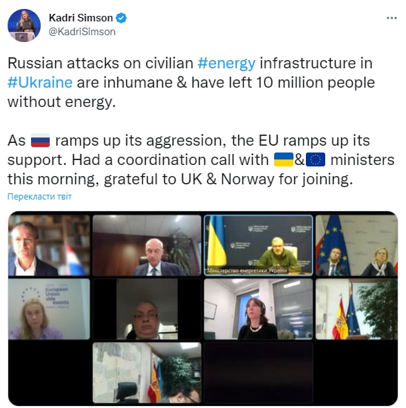 «Російські атаки на цивільну енергетичну інфраструктуру в Україні є нелюдськими і залишили 10 млн людей без електроенергії. Оскільки росія нарощує свою агресію, ЄС нарощує свою підтримку. Сьогодні вранці відбувся координаційний дзвінок між Україною та міністрами країн ЄС. Вдячна Великій Британії та Норвегії за те, що долучилися», – написала єврокомісарка з питань енергетики Кадрі Сімсон у Twitter.
