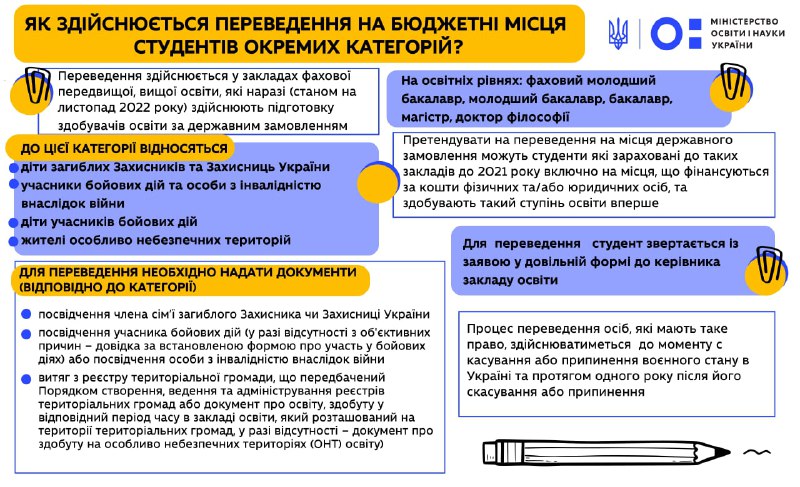 Міністерство освіти і науки України надає роз’яснення щодо виконання норм Порядку переведення на навчання за державним замовленням окремих категорій здобувачів фахової передвищої, вищої освіти, які зараховані до закладів фахової передвищої, вищої освіти до 2021 року включно на місця, що фінансуються за кошти фізичних та/або юридичних осіб (Постанова Кабінету Міністрів України № 1224 від 28 жовтня 2022 року).