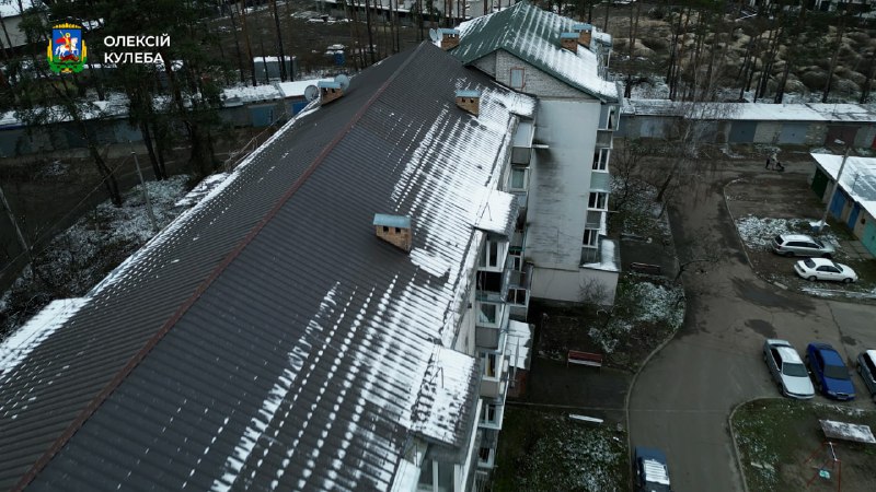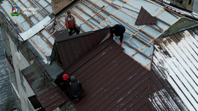 На одній із багатоповерхівок робітники ремонтують дах. Кошти на відбудову виділили з резервного фонду державного бюджету.