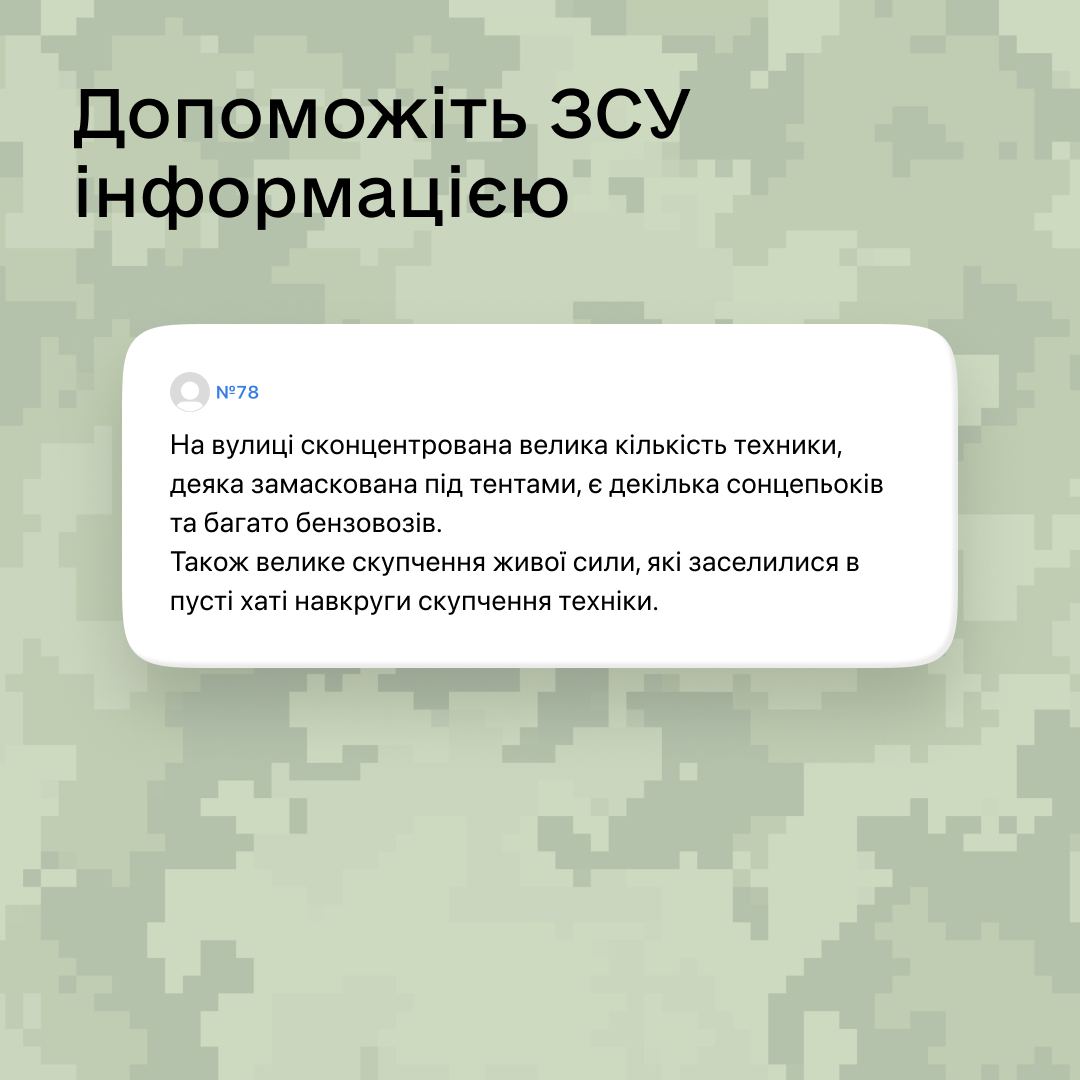 🔺Дислокацію або місця проживання окупантів із геопозицією