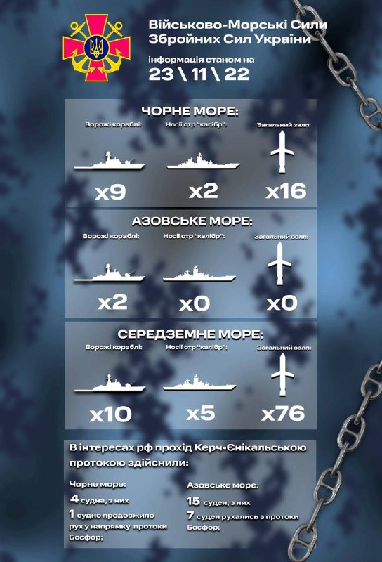 в Чорному морі на бойовому чергуванні знаходяться 9 ворожих кораблів, серед яких 2 носії отр "калібр", загальний залп 16 ракет;