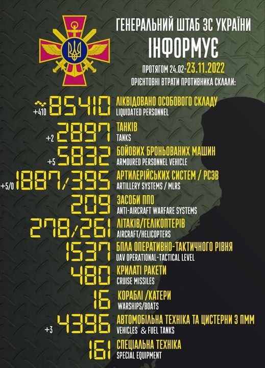Загальні бойові втрати противника з 24.02 по 23.11 орієнтовно склали / The total combat losses of the enemy from 24.02 to 23.11 were approximately: