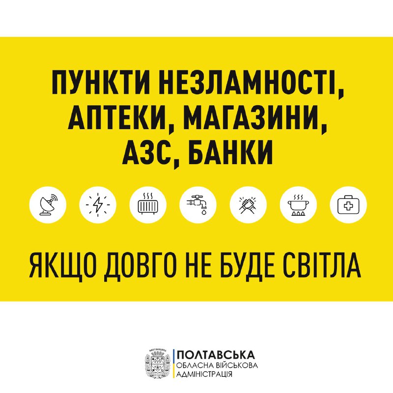 Ділюся адресами пунктів незламності, аптек, магазинів, АЗС і банків, які працюватимуть, якщо знову будуть довготривалі відключення світла, тепла, води.