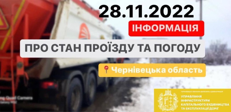 🚗 У Чернівецькій області станом на ранок 28 листопада усі дороги місцевого значення в проїзному стані 28.11.2022, Понеділок | 10:08 Автор допису: Голова Чернівецької обласної військової адміністрації 🚗 У Чернівецькій області станом на ранок 28 листопада усі дороги місцевого значення в проїзному стані. Жодних обмежень у русі немає. Про це інформує Управління інфраструктури, капітального будівництва та експлуатації доріг Чернівецької ОВА. 🌤За прогнозами синоптиків на території краю хмарно, опадів не передбачається. Температура вдень від -1 морозу до 1° тепла. Джерело Друк / PDF