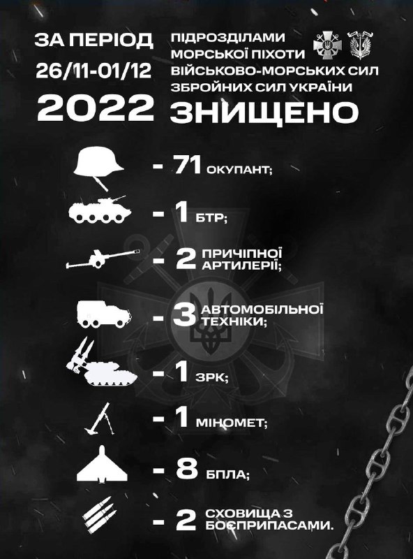 За уточненими даними в період з 26.11.2022 по 01.12.2022 наші воїни знищили: особового складу – 71 окупанта, БТР – 1, причепної артилерії – 2, ЗРК – 1, мінометів – 1, АТТ – 3, БПЛА – 8, а також 2 сховища з боєприпасами.