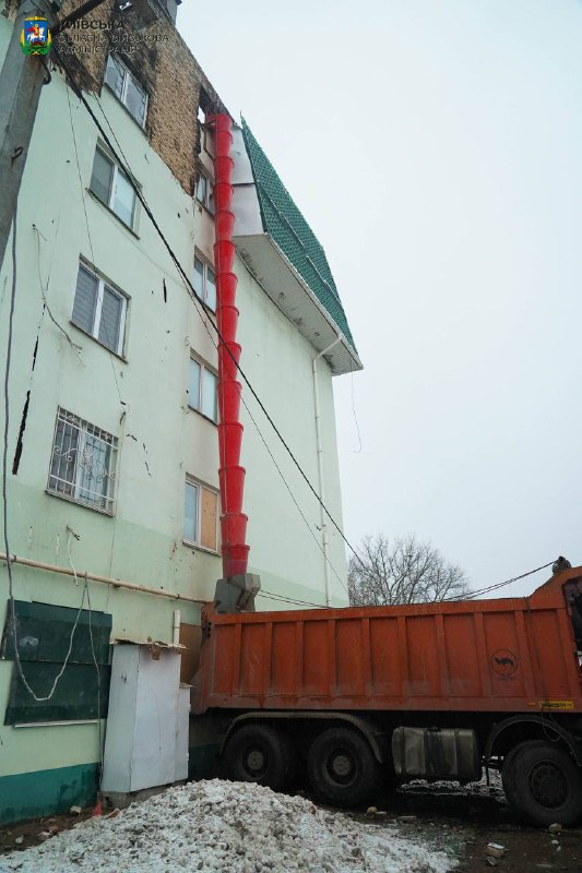 У селі Мила демонтують покрівлю та несучі стіни 6-ого поверху пошкодженої багатоповерхівки задля подальшого їхнього відновлення