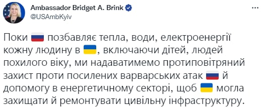 «Поки росія позбавляє тепла, води, електроенергії кожну людину в Україні, включаючи дітей, людей похилого віку, ми надаватимемо протиповітряний захист проти посилених варварських атак рф й допомогу в енергетичному секторі, щоб Україна могла захищати й ремонтувати цивільну інфраструктуру», – написалаПані посол США Бріджит Брінк у Twitter.