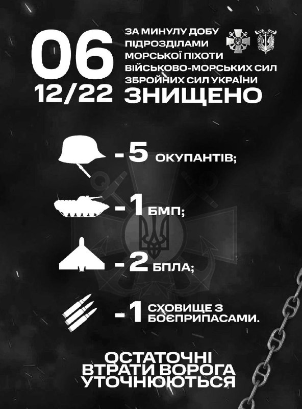 Військові частини та підрозділи Командування морської піхоти Військово-Морських Сил Збройних Сил України, які входять до складу угруповань продовжували виконувати завдання щодо відсічі повномасштабної збройної агресії російської федерації. Минулої доби, 5 грудня, морські піхотинці знищили 5 окупантів, БМП, 2 БПЛА та сховище з боєприпасами.