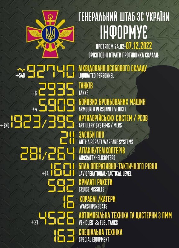 Загальні бойові втрати противника з 24.02 по 07.12 орієнтовно склали / The total combat losses of the enemy from 24.02 to 07.12 were approximately: