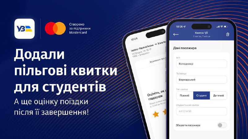 Додали кілька опцій, яких дуже чекали пасажири. Відтепер в застосунку доступні: ✅придбання пільгових квитків для студентів; ✅оцінка поїздки після її завершення.