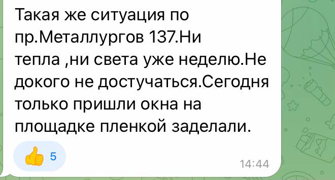 Жителі по проспекту Металургів, 137 скаржаться, що ніхто не реагує на їх запити. Лише вікна заклеїли плівкою. І це тоді, коли на вулиці мінусова температура. Мешканці замерзають у власних квартирах.