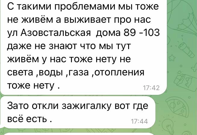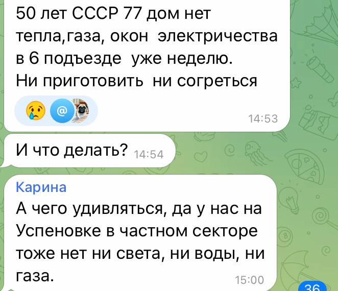 Мешканці міста пишуть, що у будинках досі немає не лише опалення, але й газу та електрики. Люди замерзають, а електрообігрівачами, які роздають окупанти, не можуть скористатися.